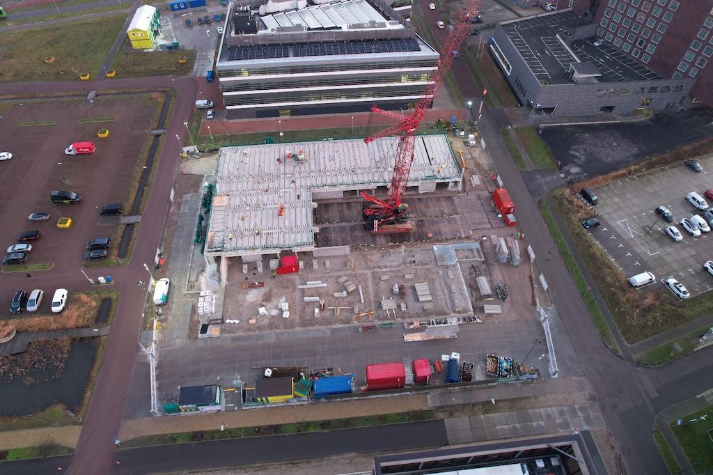Covering 9,100m² across four floors, the state-of-the-art facility will house laboratories and offices for life science, health, and pharmaceutical research. Due to the site’s limited space in the busy science park, precast concrete and steel modules were chosen, with Mammoet supporting main contractor Dura Vermeer Bouw Zuid West and concrete supplier Holcon BV in the assembly of the structure.