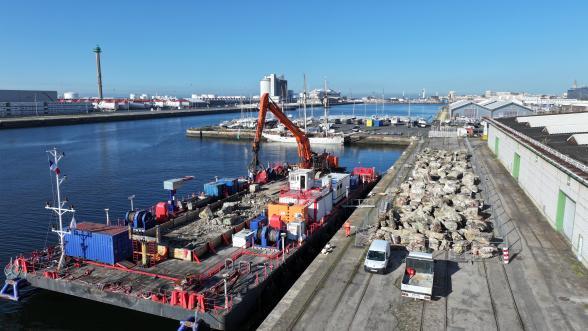 The removal was carried out using adapted excavators operating both from land at low tide near the south breakwater of the historic port, and from the Ouistreham barge when required by sea conditions.