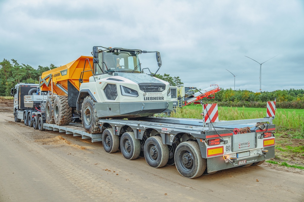 During a recent operation, the MAX710 was tasked with transporting a 56-tonne crusher to a quartz sand quarry near Haltern am See. The final access route to the site included uneven ground, narrow passages and tight bends—conditions typical of construction and quarry environments. Equipped with 19.5-inch pendle axles offering high lift and a large steering angle, the MAX710 maintained stability and precise tracking throughout the journey, even in restricted terrain.